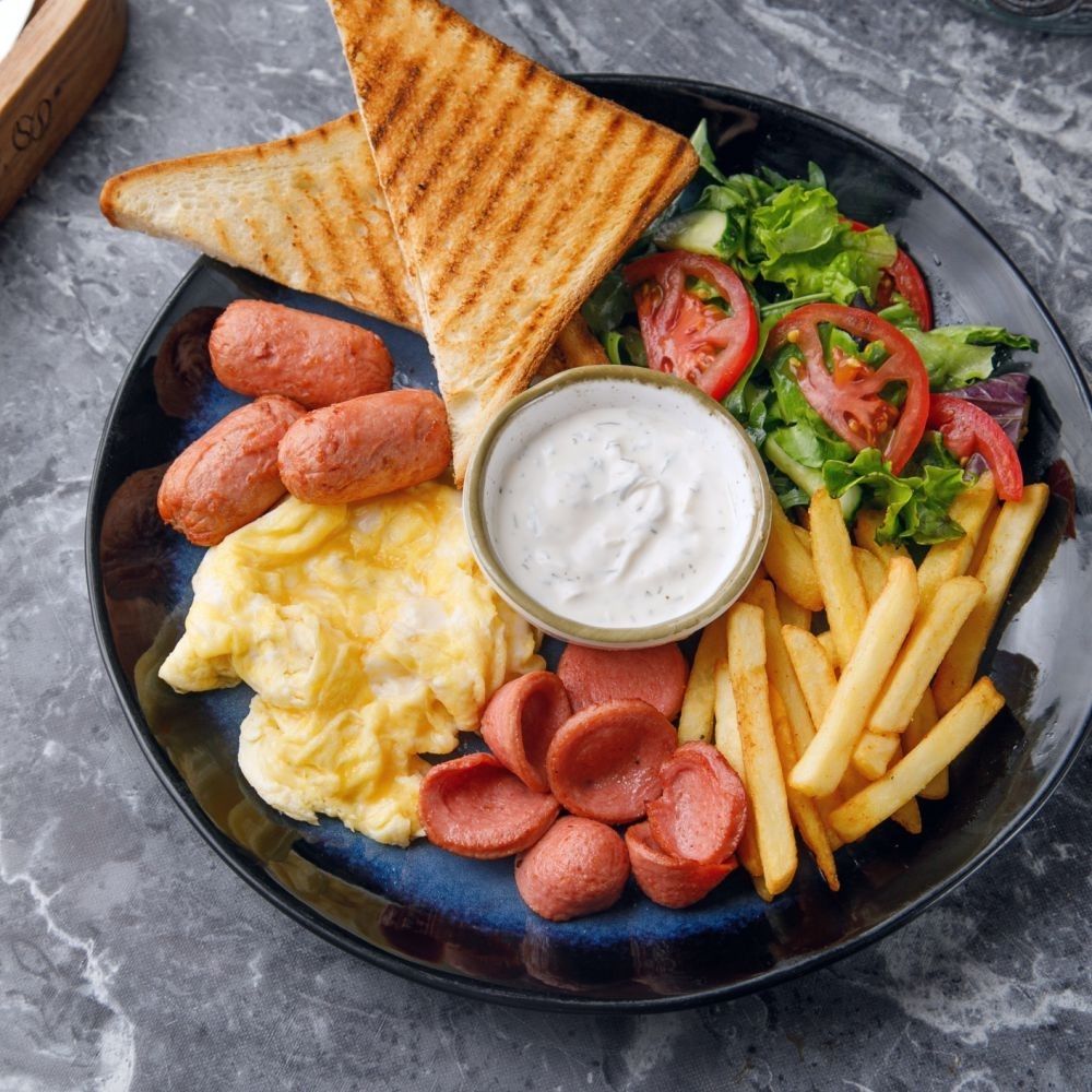 Омлет, тауық еті шұжығы, сиыр еті шұжығы, микс салаты, картоп фри, сарымсақ- қаймақ соусы, тост наны / Омлет, колбаски куриные, сардельки, овощной салат, картофель фри, чесночно-сметаны соус, тост