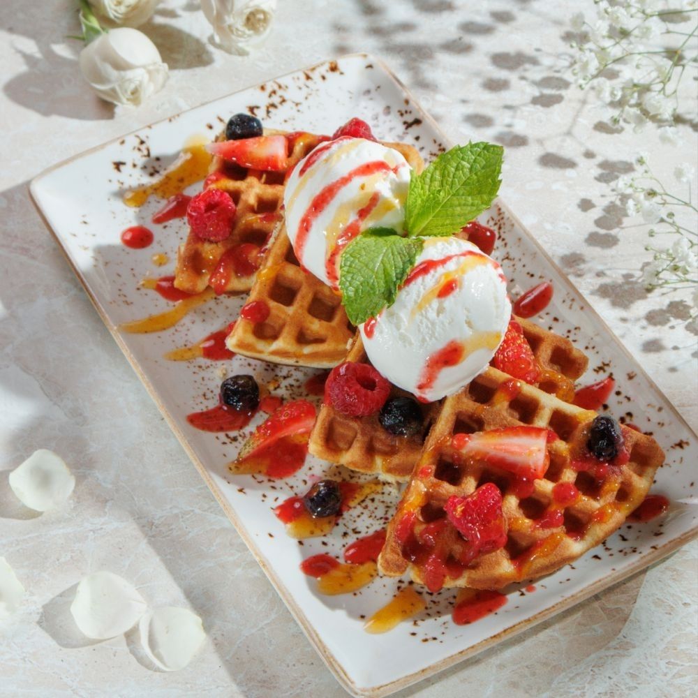 Вафли,өрік джемі, құлпынай джемі, құлпынай, мұздатылған қарақат, таңқұрай, ақ балмұздақ/ Вафли, абрикосовый джем, клубничный джем, клубника свежая, черника, малина, сливочное мороженое