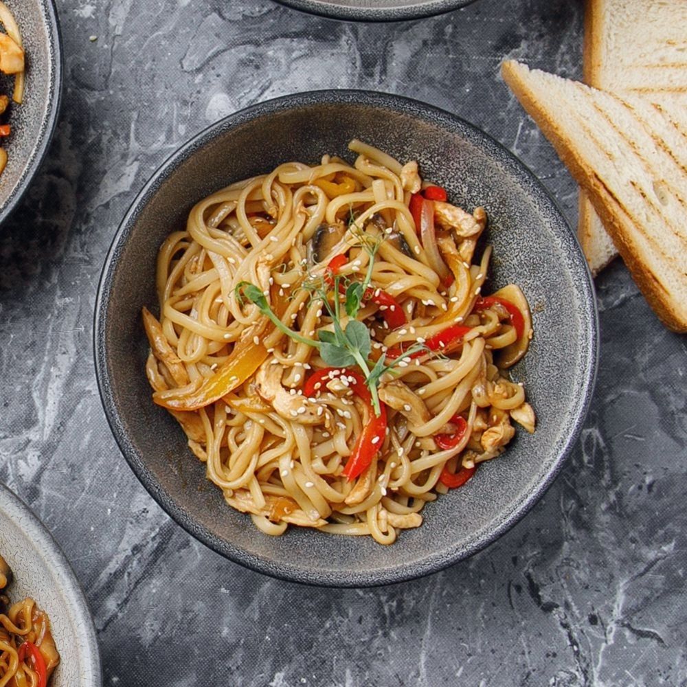 Удон кеспесі, тауық еті, саңырауқұлақтар, болгар бұрышы, пияз,терияки соусы, кунжут дәндері/ Лапша удон, грибы шампиньоны, куриное филе, перец болгарский, терияки, кунжутные семечки