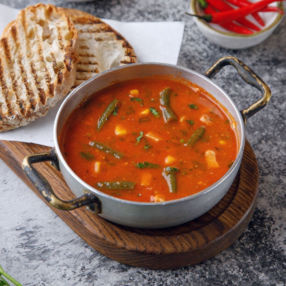 Тауық еті,үрме бұршақ,жүрегі, қызынақ зире, пульпа соусы, табаско соусы,кинза, чиаббата наны/ Куриное филе, соус болоньезе, стручковая фасоль, кукуруза, тмин, кинза, чиабатта