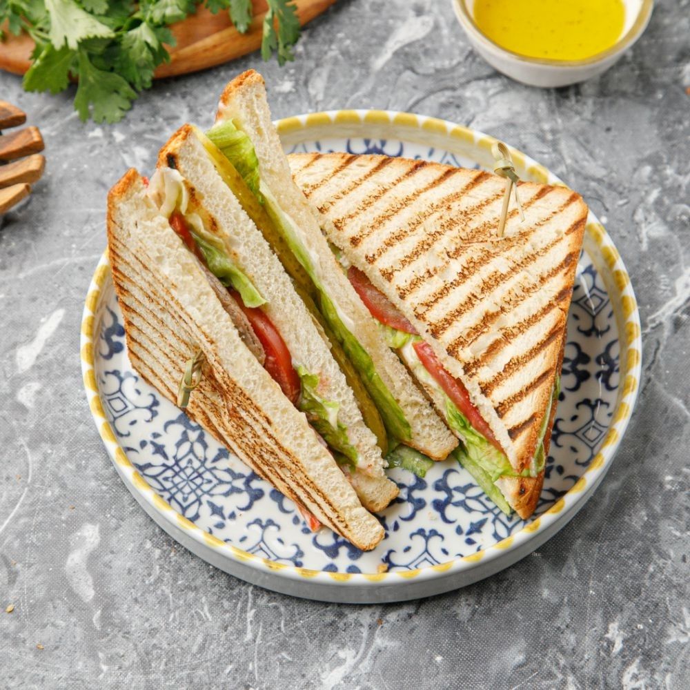 Тост нані, сиыр еті, тауық еті, клаб соусы, тұздалған кішкентай қияр, қызанақ,айсберг/Тосты, филе говядины, филе куриное, соус клаб, корнишоны, помидоры, айсберг