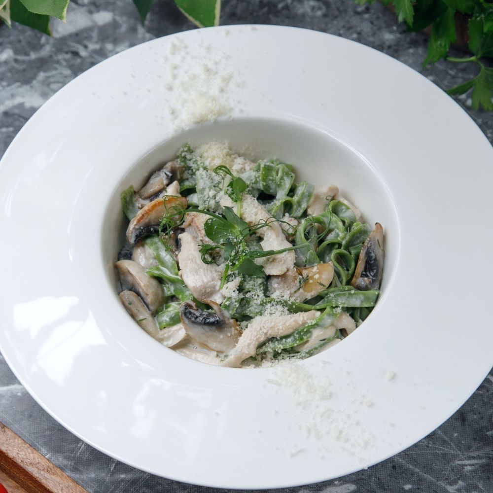Шпинат қосылған тальятелле,тауық еті, шампиньон саңырауқұлағы, пияз, кілегей, пармезан ірімшігі/ Широкая лапша со шпинатом, грибы шампиньоны, куриное филе, лук репчатый, сливки, соль