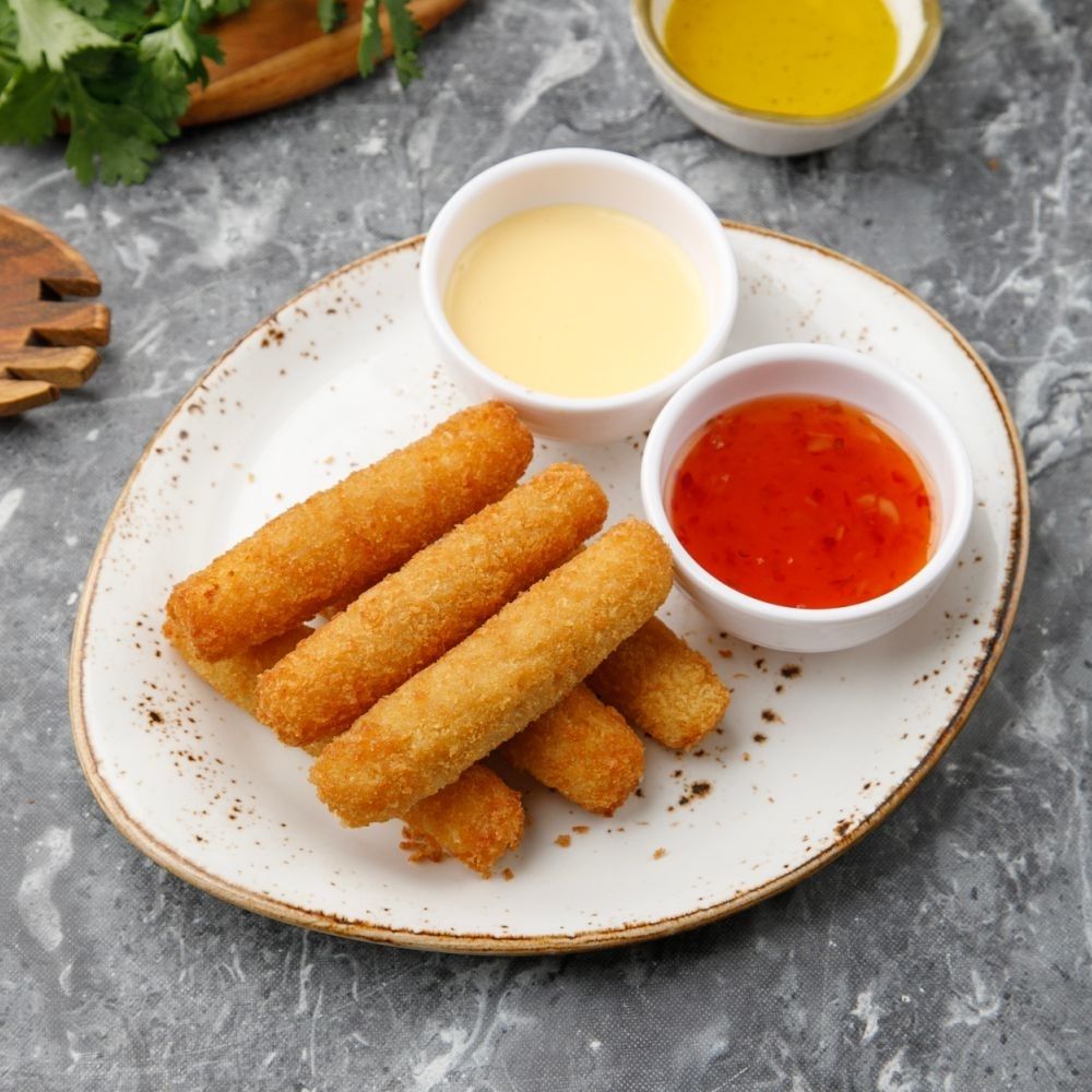 Гауда ірімшігі, панко сухари, жұмыртка, сүт, ірімшік соусы, тәтті және қышқыл чили соусы/Сыр гауда, сухари панко, яйцо, молоко, соус сырный, сладкий соус чили