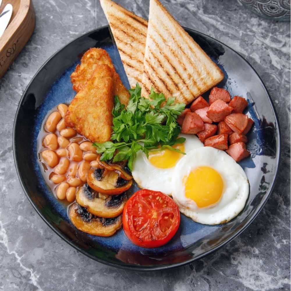 Жұмыртқа, қызанақ, саңырауқұлақтар, хэшбраун, шұжық, қызанақ соуысандағы атбас бұршақтары, тост наны / Яйца жареные, помидор, грибы, хэш браун, сардельки, белая фасоль в томатном соусе и тост
