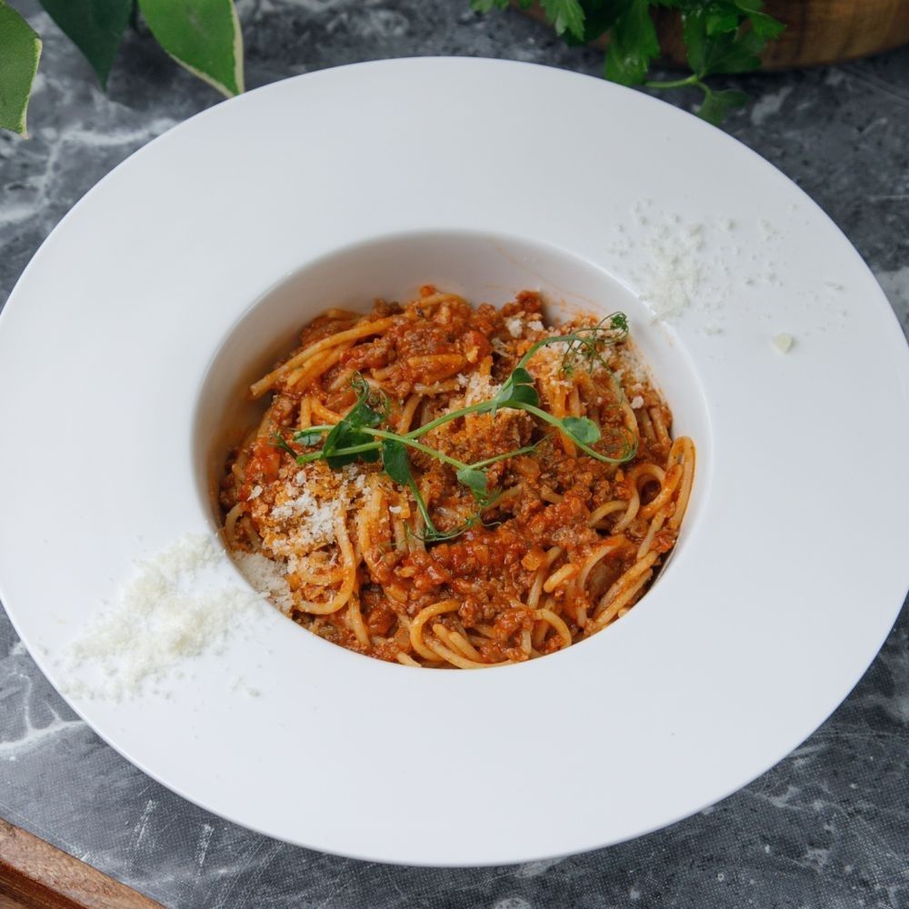 Спагетти , тартылған сиыр еті, пияз, болоньезе соусы, сәбіз езіндісі,пармезан ірімшігі, дәмдәуіштер/ Спагетти, фарш говяжий, лук репчатый, соус болоньезе, морковное пюре, пармезан, специи