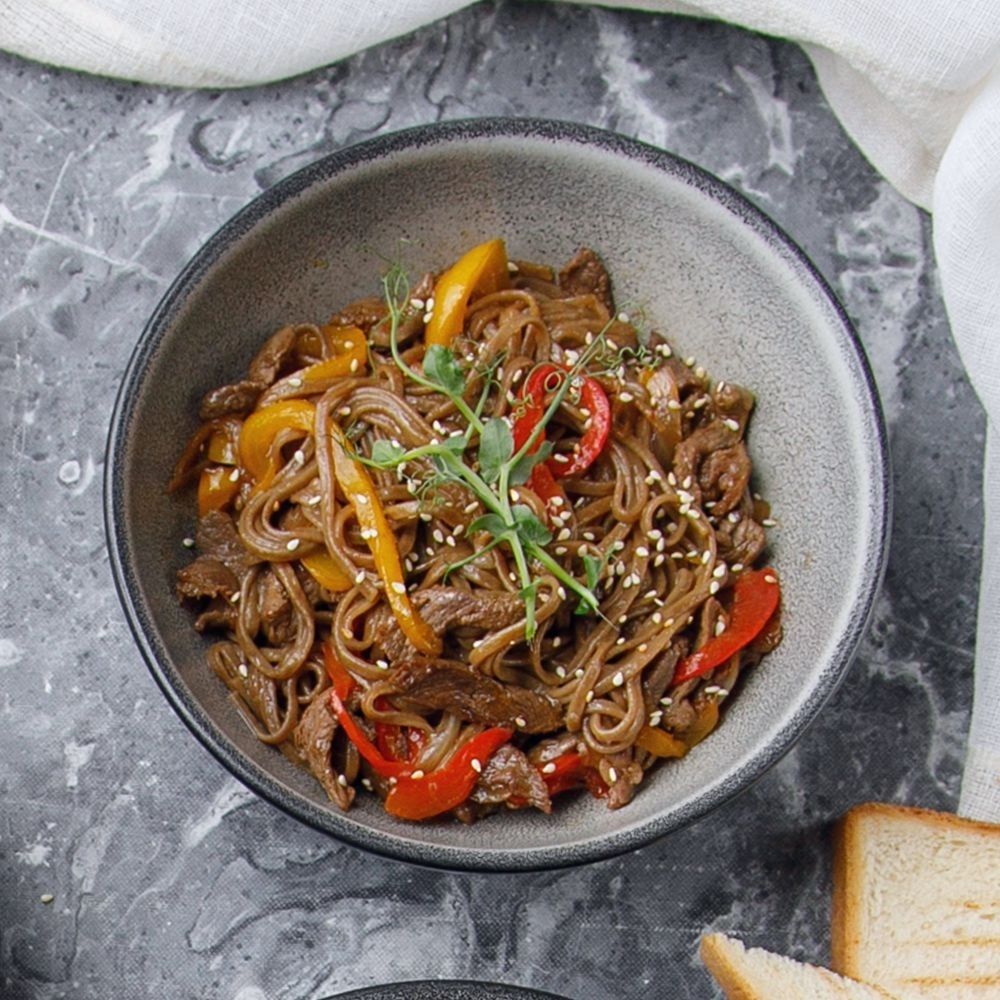 Қарақұмық кеспесі,сиыр еті, болгар бұрышы, пияз, кунжут дәндері,терияки соусы/ Лапша гречневая, филе говядины, перец болгарский, соус терияки, лук репчатый, кунжут