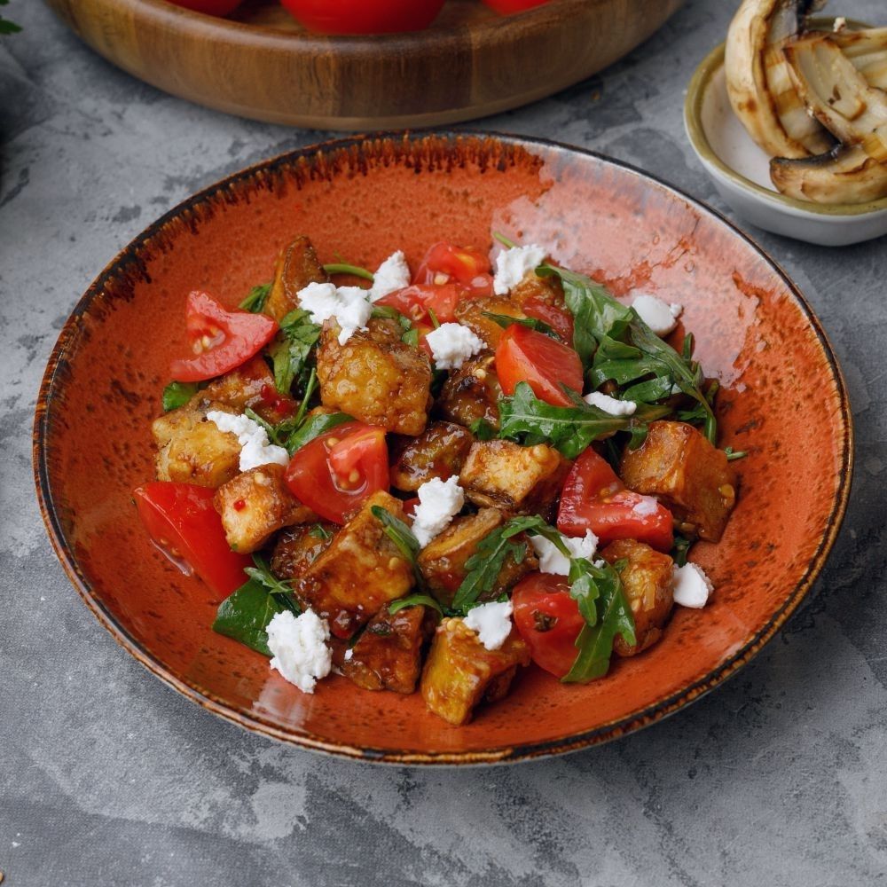 Баялды және ешкі ірімшігі қосылған салат/Салат с баклажанами и козьим сыром