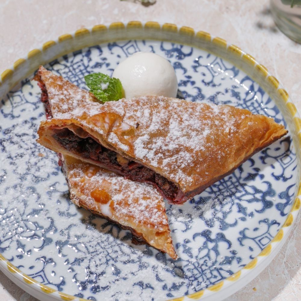 Қатпарлы қамыр, даршин, жаңғақ, шие, ұнтақ қант, бамұзддақ/ Тесто слоёное, корица, грецкий орех, вишня, сахарная пудра