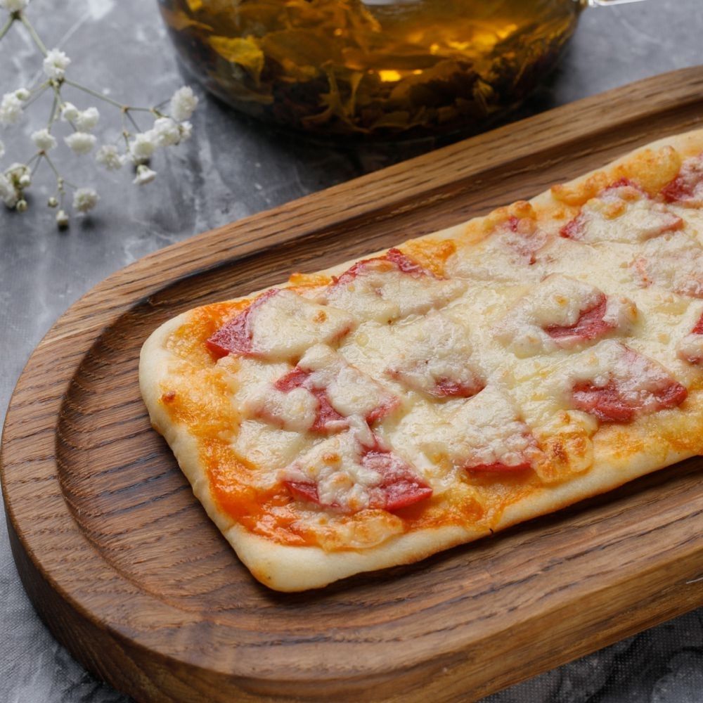 Пиццаға арналған соус, гауда ірімшігі, моцарелла ірімшігі, шұжық/ Пицца (10*20 см). Тесто для пиццы, соус кетчунез, сыр гауда, моцарелла, колбаса халял