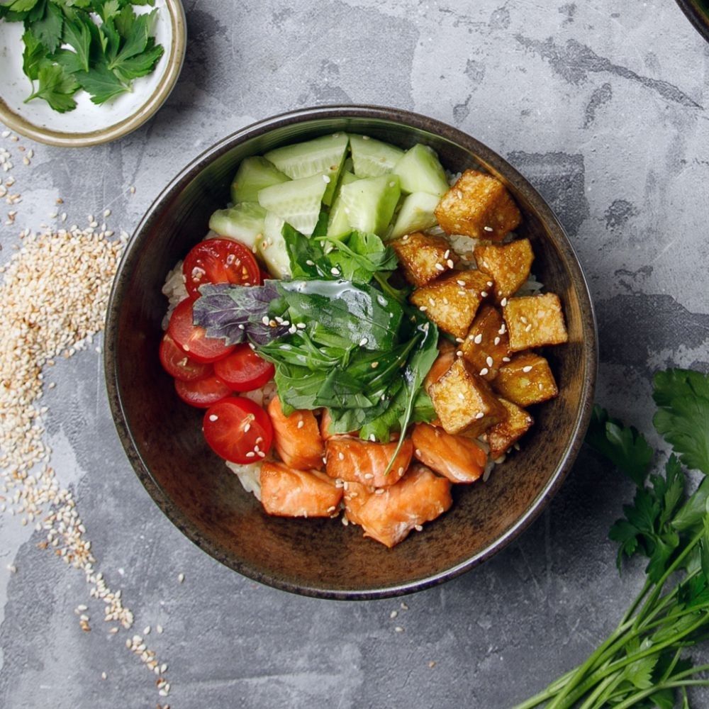Бұқтырылған күрыш, пісірілген қызыл балық , қияр, черри қызанағы , унаги соусында қуырылған баялды, микс салаты/Рис, сёмга запеченная, огурец, черри, баклажан жареный в соусе унаги, микс салата