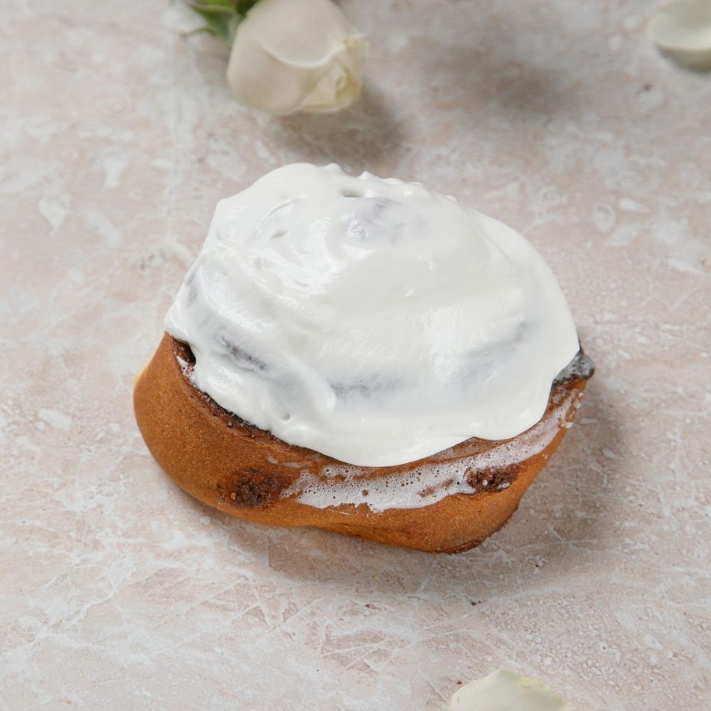 Корицадан жасалған бөлке,креметте ,кілегей , шекер ұнтағы/ Булочка с корицей, сыр творожный, сливки, сахарная пудра