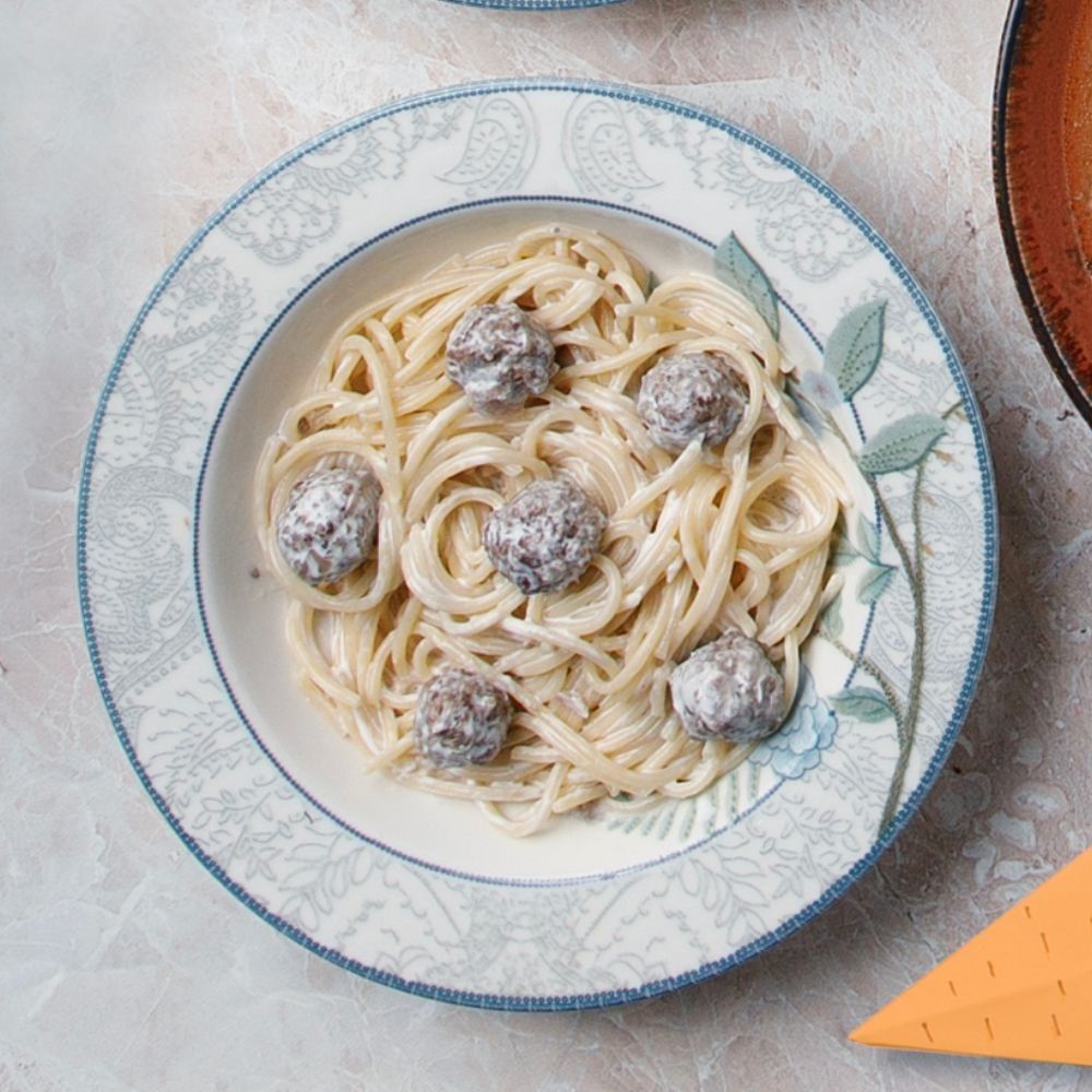 Спагетти сиыр етінен, жасалған фрикаделькілер, кілегей/ Спагетти, фрикадельки говяжьи, сливки
