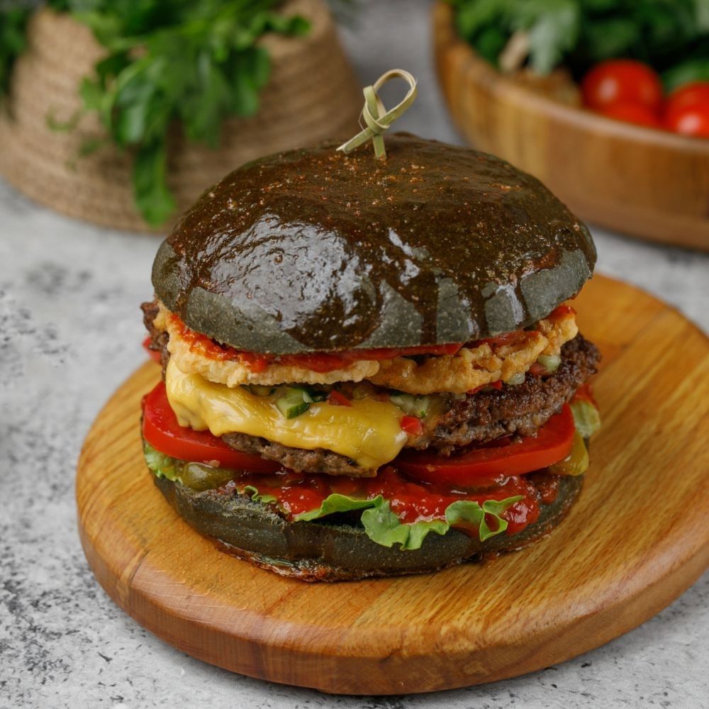 Қара нан, сиыр еті котлеті, қызанақ, тұздалған қияр, чеддер ірімшігі, көкөніс сальсасы, пияз сақиналары, айсберг, BBQ соусы/ Чёрная булочка, котлета из говядины, помидоры, корнишон, сыр чеддер, овощная сальса, луковые кольца, сыр чеддер, айсберг, соус BBQ