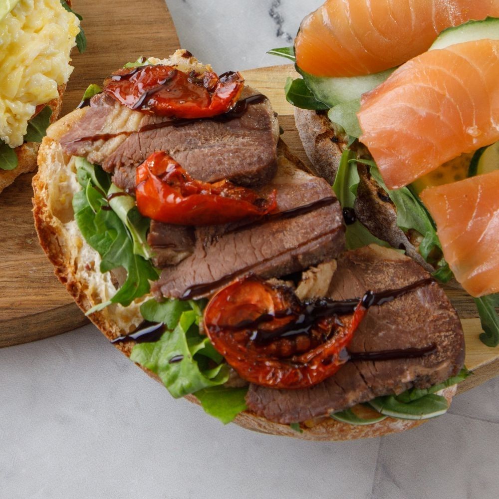 Чиабатта, қыша соусы, микс салата, қазы, кептірілген қызанақ / Чиабатта, горчичный соус, микс салата, казы, вяленые помидоры,
