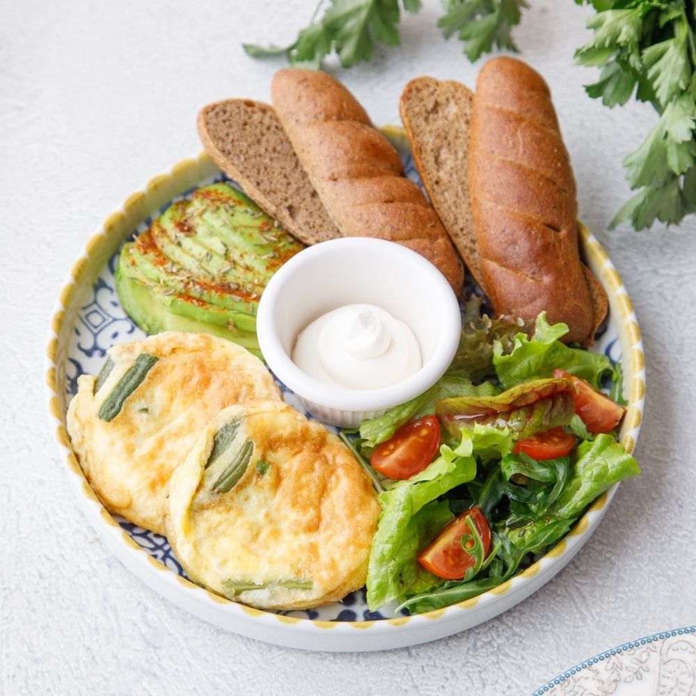 Авокадо, жұмыртқа, жасыл бұршақ, черри қызанағы, микс салаты, қияр, кремет ірімшігі, мини қара бидай бөлке нан, лимон / Авокадо, яйцо, стручковая фасоль, черри, микс салата, огурец, мини ржаной багет, лимон